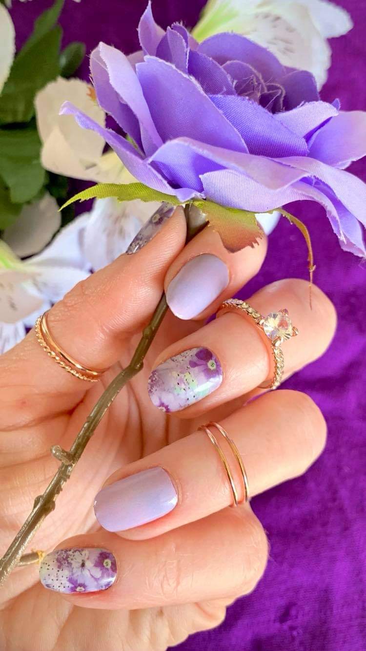Get hassle-free salon-quality nails at home! No wet polish, smudges, or dry time. You get 16 Lavender Blooms Nail Wraps, good for one full manicure with strips to spare, so you can mix and match your extra strips to create your own unique designs.
